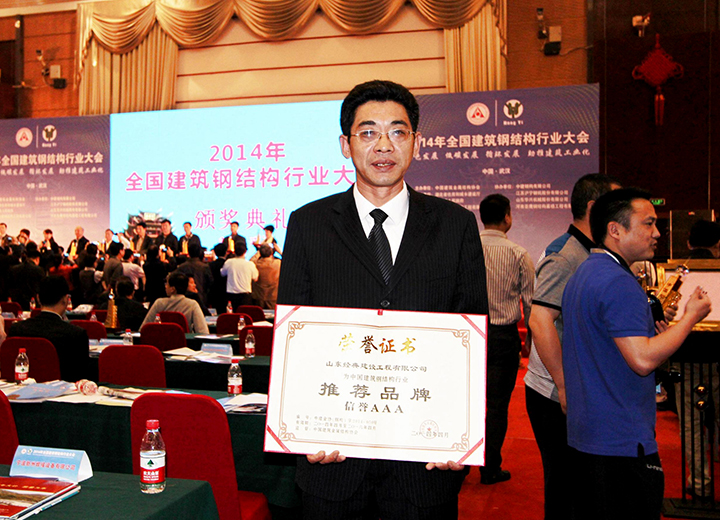 參加中國(guó)鋼結(jié)構(gòu)協(xié)會(huì)成立三十周年紀(jì)念大會(huì)當(dāng)選常務(wù)理事單位,榮獲首批全國(guó)鋼結(jié)構(gòu)行業(yè)AAA級(jí)信用企業(yè)、中國(guó)鋼結(jié)構(gòu)行業(yè)杰出貢獻(xiàn)人物、2014年度鋼結(jié)構(gòu)杰出人才獎(jiǎng)。