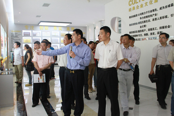 考察團(tuán)一行參觀了經(jīng)典集團(tuán)的文化館、項(xiàng)目中心、綜合辦公室、營(yíng)銷(xiāo)中心和生產(chǎn)車(chē)間。苗樹(shù)文董事長(zhǎng)向考察團(tuán)介紹了經(jīng)典集團(tuán)的生產(chǎn)經(jīng)營(yíng)、項(xiàng)目建設(shè)、產(chǎn)學(xué)研合作、技術(shù)創(chuàng)新等情況。隨后,考察團(tuán)一行實(shí)地參觀了經(jīng)典集團(tuán)職工培訓(xùn)室、閱覽室、乒乓球室、臺(tái)球室、愛(ài)心超市和宴會(huì)廳,進(jìn)一步了解了企業(yè)的文化建設(shè)有關(guān)情況。