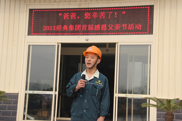 2013年6月16日上午7點(diǎn)30分,經(jīng)典集團(tuán)開(kāi)展2013年度父親節(jié)“送溫暖,獻(xiàn)愛(ài)心”活動(dòng),為集團(tuán)全體員工的父親送上愛(ài)心手機(jī),千元節(jié)日紅包,集團(tuán)董事長(zhǎng)苗樹(shù)文,總經(jīng)理杜福生及高層領(lǐng)導(dǎo)先后致辭并發(fā)放獎(jiǎng)金及手機(jī)。活動(dòng)舉行完后,經(jīng)典集團(tuán)總經(jīng)理杜福生親自到部分員工家中為員工父親送上集團(tuán)的問(wèn)候與節(jié)日祝福。