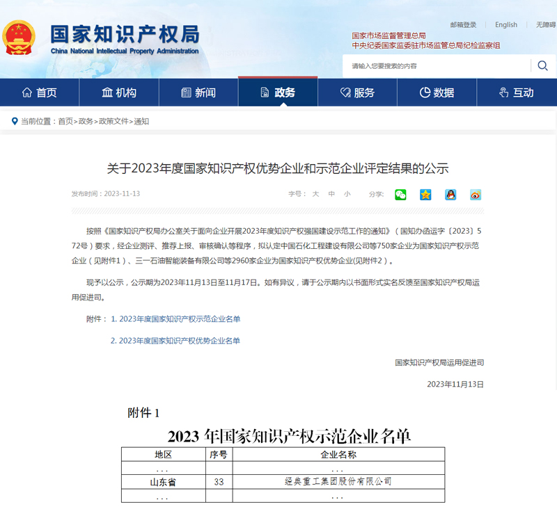 近日,國家知識(shí)產(chǎn)權(quán)局對(duì)2023年度國家知識(shí)產(chǎn)權(quán)示范企業(yè)和優(yōu)勢(shì)企業(yè)評(píng)定結(jié)果的公示。其中,經(jīng)典集團(tuán)被認(rèn)定為“2023年國家知識(shí)產(chǎn)權(quán)示范企業(yè)”。
