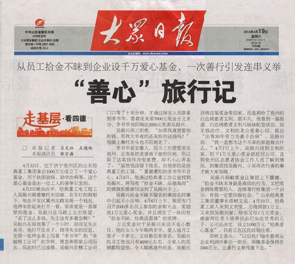 4月12日,位于濟寧兗州區(qū)的山東經(jīng)典重工集團拿出1000萬成立了一個愛心基金,用于扶困助殘、助學治病等。這個愛心基金是由一位工人的善行義舉引發(fā)的。