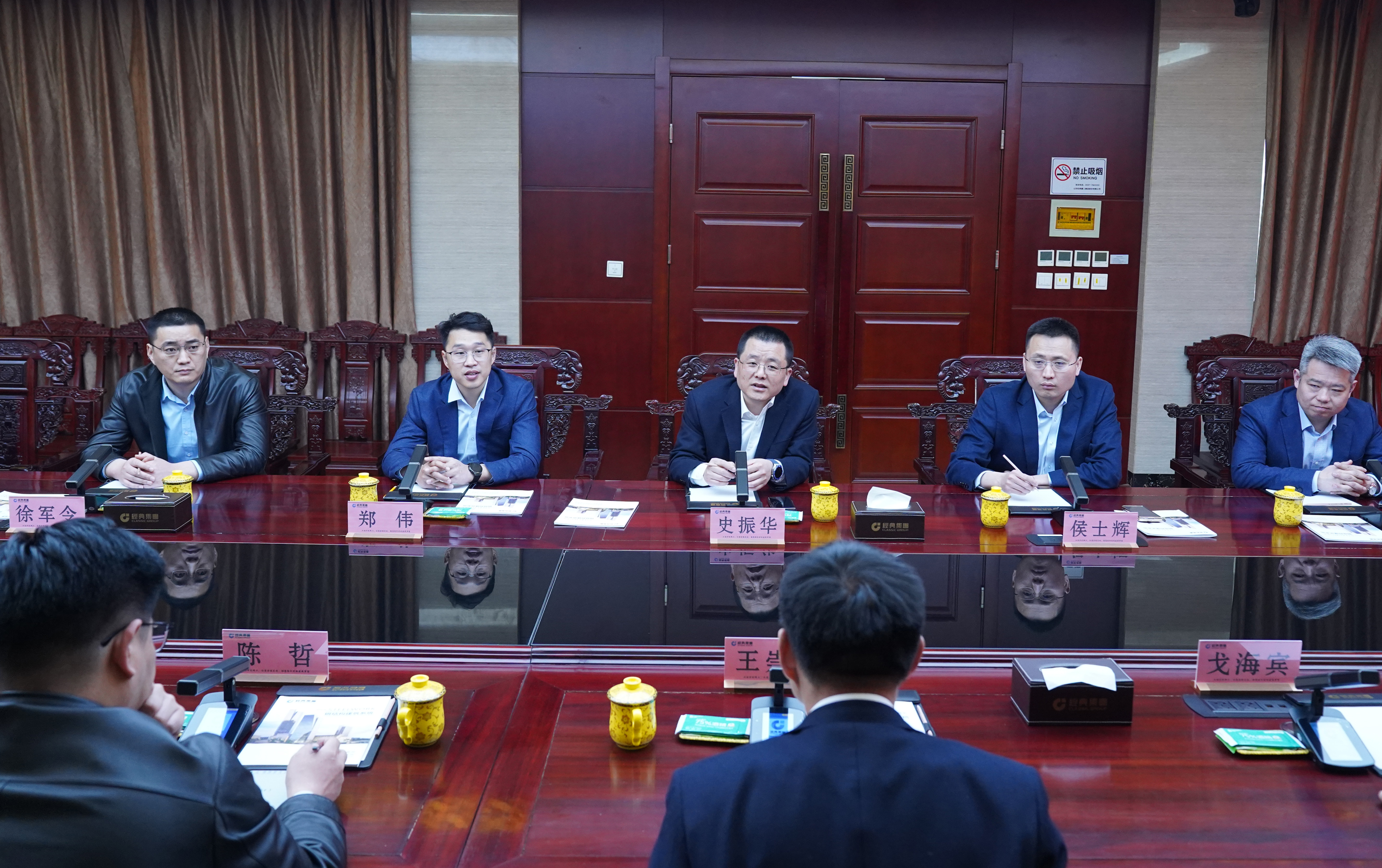 3月22日上午,濟(jì)寧能源發(fā)展集團(tuán)有限公司黨委副書記、總經(jīng)理王崇景,山東融匯物產(chǎn)集團(tuán)黨委書記、董事長陳哲,金橋煤礦黨委書記、礦長戈海賓,山東融匯物產(chǎn)集團(tuán)副總經(jīng)理、山東京杭智慧新鋼投資運(yùn)營公司董事長陳瑞亮等一行到經(jīng)典集團(tuán)考察洽談合作。